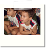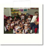 Os alunos ouvem, atentamente, a professora contar a história do Cebolinha e as confusões com um porquinho.